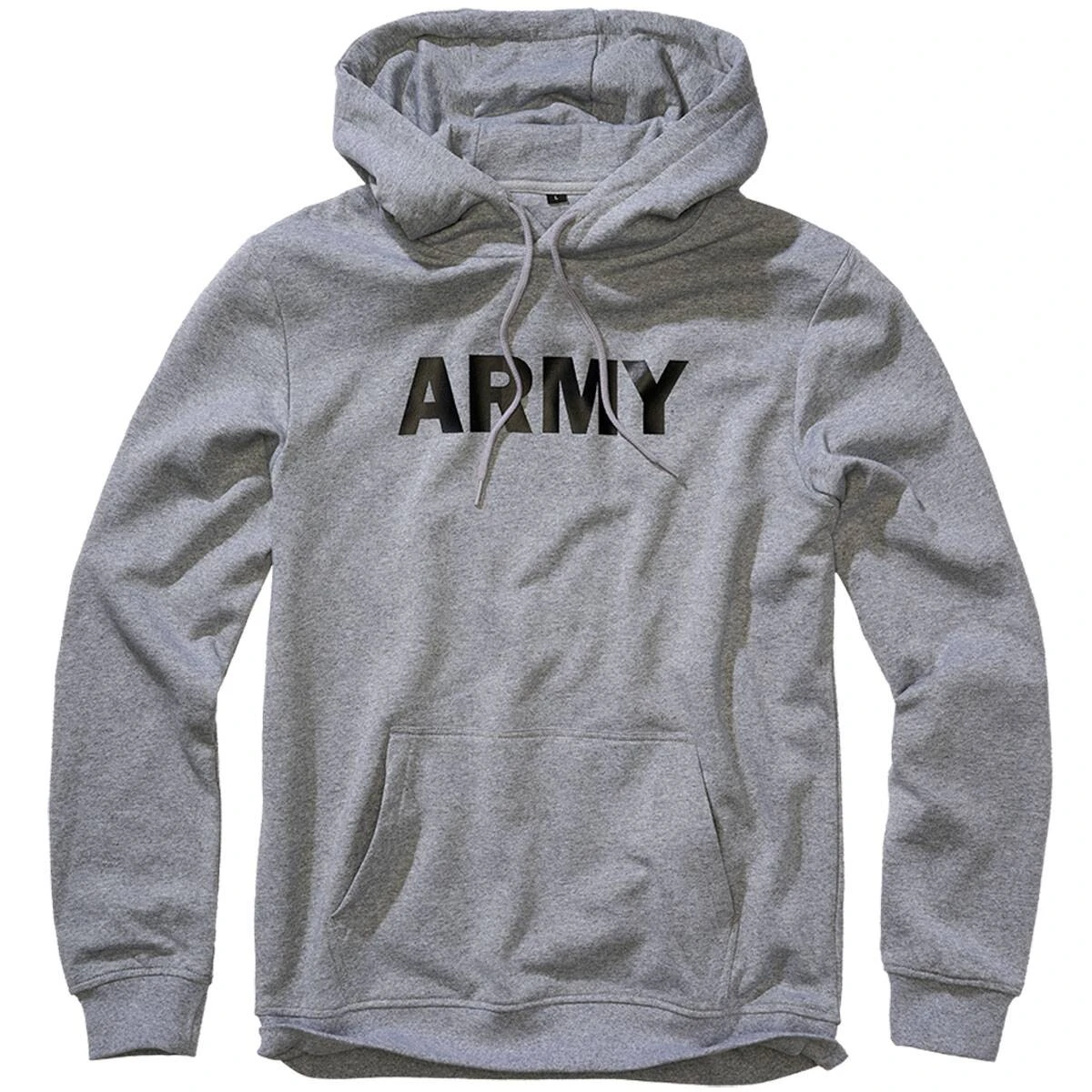 Der Army Hoody von Brandit ist ein lässiger Kapuzenpullover aus einem angenehmen Baumwoll-Mix, der durch seinen ARMY-Print auf der Brust sofort ins Auge fällt. Die Kapuze mit Tunnelzug und die langen Ärmel vermitteln das typische Hoodie-Gefühl, während Rippstrickbündchen an den Abschlüssen eine bequeme Passform unterstützen. Dank der Känguru-Tasche auf der Vorderseite sind Kleinigkeiten wie Smartphone oder Schlüssel stets griffbereit und sorgen für zusätzlichen Komfort. Im Inneren ist der Kapuzensweater leicht angeraut (brushed fleece), was für ein warmes und weiches Tragegefühl sorgt. Mit 270 g/m² Materialstärke ist der Hoody sowohl alltagstauglich als auch angenehm zu tragen.