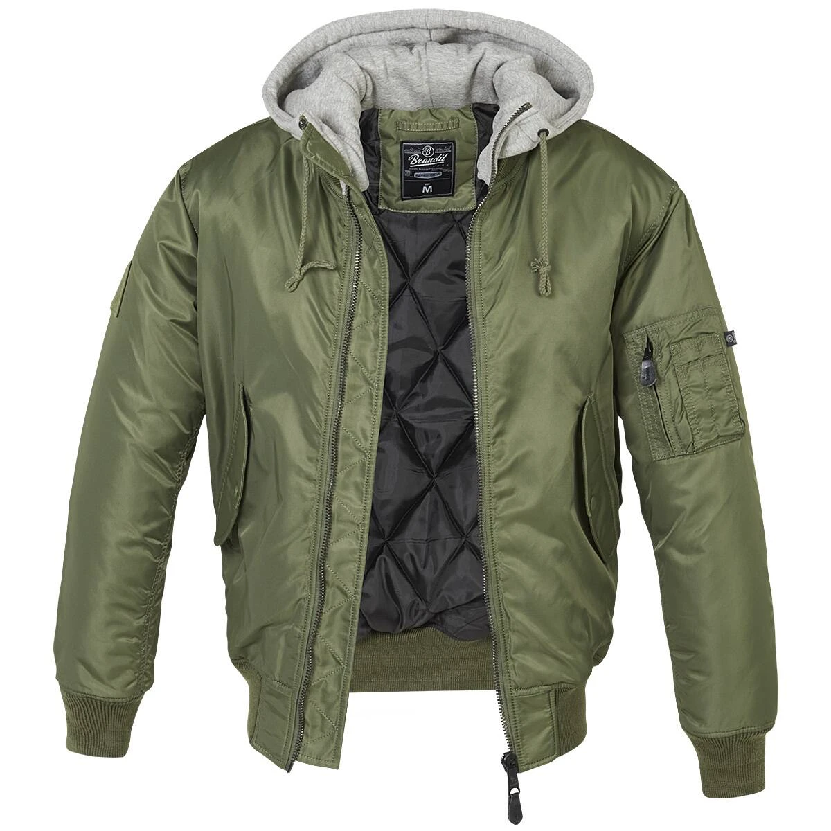 Die MA1 Sweat Hooded Jacke von Brandit wurde im Stil klassischer Bomberjacken gefertigt. Als besonderes Highlight besitzt sie eine Kapuze aus weichem Sweat-Stoff, die mittels Tunnelzug eng am Kopf getragen werden kann. Der Pilotenblouson besteht aus einem besonders strapazierfähigen und hochwertigen Nylonmaterial, welches wind- und wasserabweisend ist. Die Jacke besitzt zwei seitliche Schubtaschen mit Patten sowie eine Oberarmtasche mit Reißverschluss und Armbüro. An den Ärmeln und am Saum befinden sich Strickbündchen. Insgesamt besticht die Jacke durch Ihren hohen Tragekomfort und ihrer Strapazierfähigkeit.