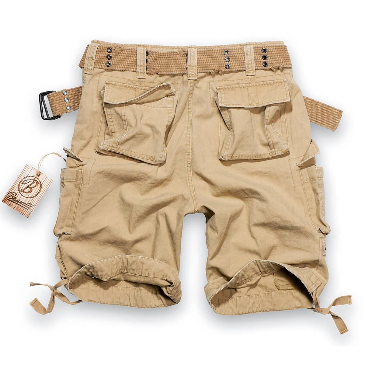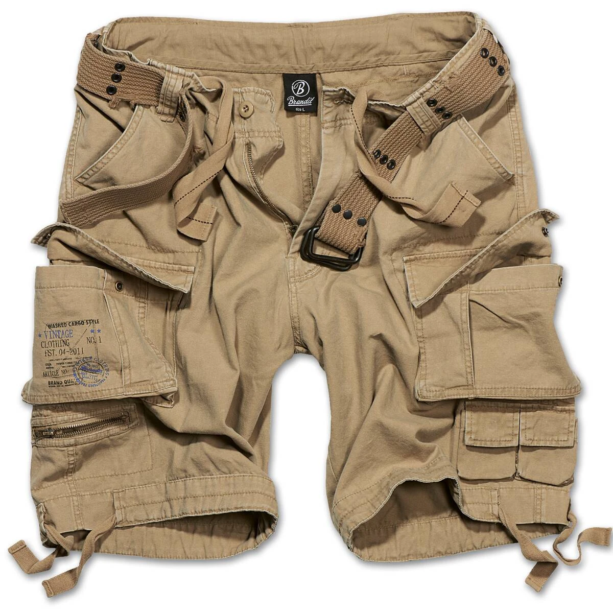 Die Brandit Savage Vintage Shorts (ehem. Gladiator Shorts) ist eine entspannte Cargo-Bermuda aus superleichter, weicher und dennoch robuster Baumwolle mit einem hochwertigen Vintagegürtel. Die tolle Sommerhose im äußerst bequemen und legeren Schnitt besitzt 2 große Bein-Cargotaschen mit Druckknopfverschluss, 2 Minipockets und ein praktisches Reißverschlussfach am Bein, 2 schräg aufgenähte Seitentaschen sowie 2 Gesäßtaschen. Damit ist sie die optimale Short für alle Aktivitäten im Outdoorbereich. Die verwaschenen Farben und der damit verbundene leichte Used-Vintage-Look sowie der dezente Army-Pocket-Print auf der rechten Beintasche machen die Savage Vintage Shorts zu einem echten Hingucker. Im Bund und an den Beinsäumen besitzt sie Tunnelzüge. Die Savage wird einem Reißverschluss (Zip-Fly) geschlossen.