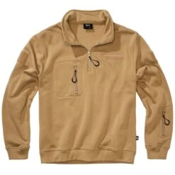 Der Brandit Tactical Sweat Troyer vereint Hoodie-Komfort mit taktischen Details. Innen angerautes Fleece-Mischgewebe speichert Wärme und liegt angenehm weich auf der Haut. Eine Kapuze mit Kordelzug schützt vor Wind, während der durchgehende Troyer-Reißverschluss das An- und Ausziehen erleichtert. Eine Brust- und eine Armtasche auf dem linken Unterarm organisieren Kleinteile; Loop-Panels vorn und an den Oberarmen nehmen Patches auf. Breite, elastische Bündchen schließen Kälte aus und halten den Pullover in Form.
