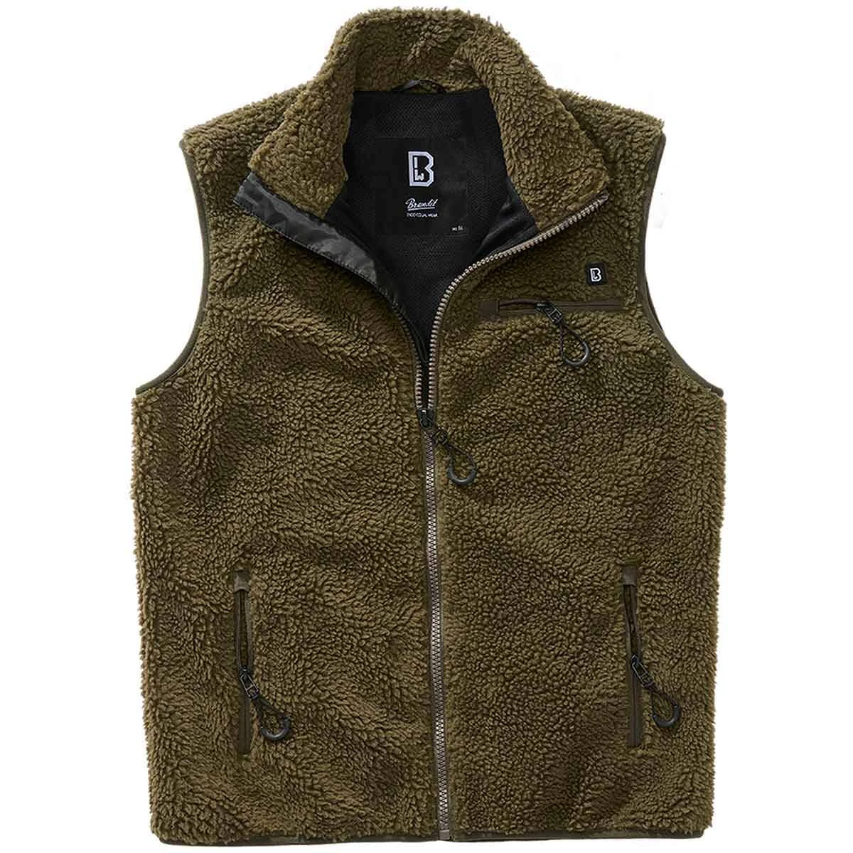Die olivfarbene Teddyfleece Weste für Männer von Brandit mit Stehkragen und dem elastischen Saum ist eine wärmende Allroundweste aus hochflorig-warmen Teddy-Fleece. Das atmungsaktive Mesh-Innenfutter und der gerade Schnitt sorgen für ein angenehmes Tragegefühl. Ein hochwertiger Mittelreißverschluss, der Kinnschutz sowie die Windschutzleiste bieten ausreichend Komfort. Weitere praktische Details sind die 2 seitlichen Taschen mit Reverse-Reißverschlüssen. Die Innentasche wird mit einem hochwertigen Klettverschluss geschlossen. Alle Zipper-Puller sind vorgeformt und hochwertig verarbeitet. Diese bequeme Weste ist die perfekte Ergänzung Ihrer Garderobe für die kühlen Tage.