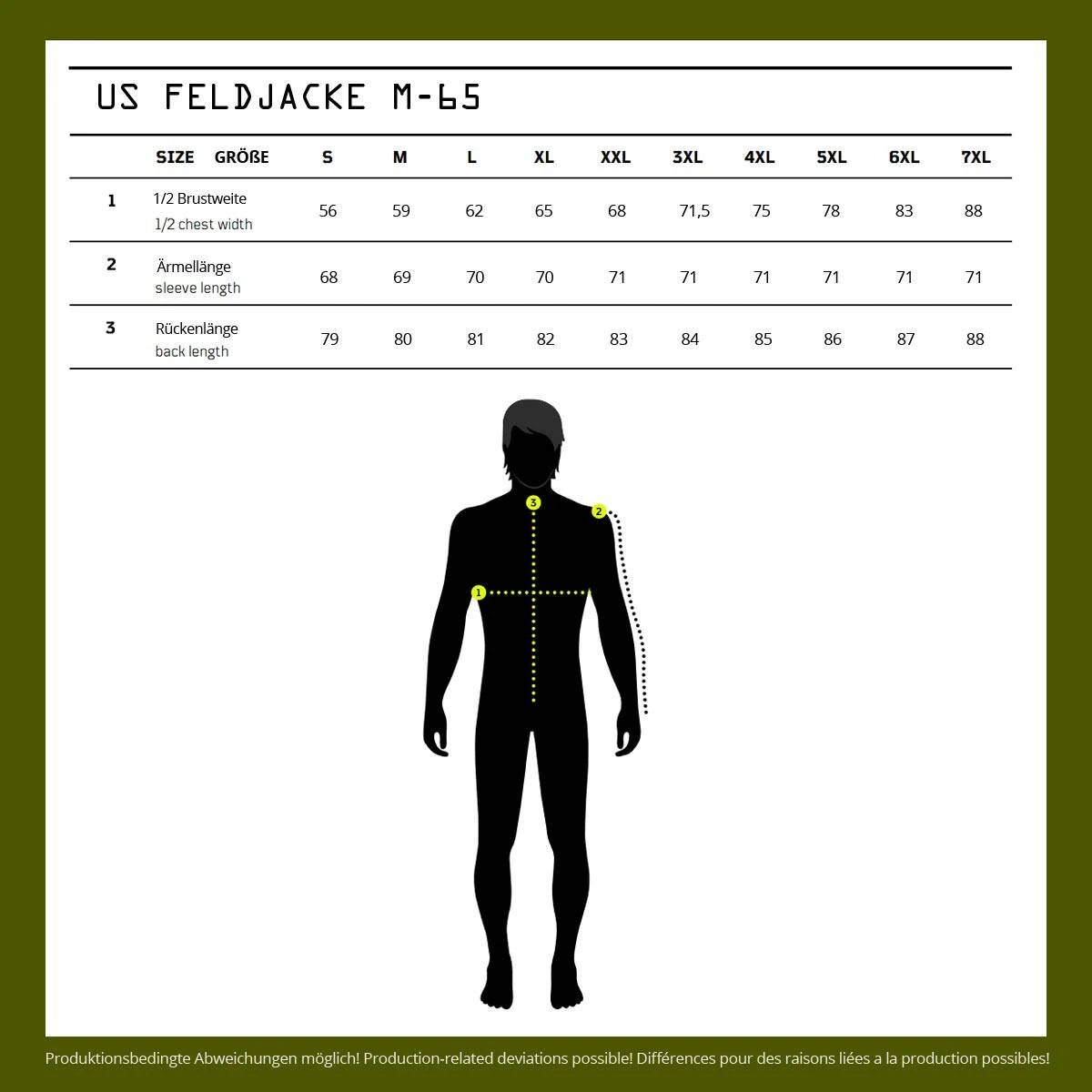 Die Jacke mit Baumwollfutter und ausknöpfbarem Zweitfutter ist die funktionelle Outdoor-Jacke nach dem Schnittmuster der legendären US Feldjacke M-65. Kombiniert mit dem Jacketliner hält sie im Winter sehr warm. Sie ist aber auch ideal als Übergangsjacke geeignet, wenn Sie das Futter einfach herausknöpfen. Die M-65 enthält 4 aufgesetzte große Pattentaschen sowie einen Frontreißverschluss, der durch eine Knopfleiste winddicht abgedeckt wird. Im Kragen befindet sich eine eingearbeitete Kapuze (mit Reißverschluss). Außerdem gibt es einen Kordelzug am Saum und an der Taille mit dem man die Weite bequem regulieren kann. Die Ärmel können durch Klettverschlüsse in der Weite verstellt werden.