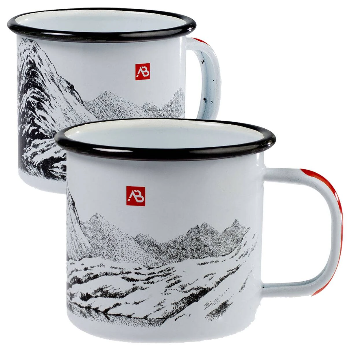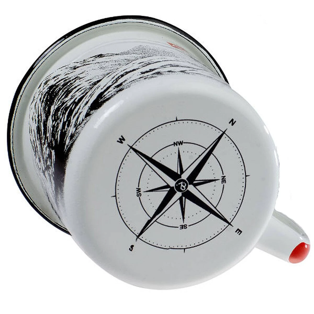 Die Email Tasse von AB Outdoor besticht durch ihr schlichtes Design und ihr hübsches Gebirsmotiv (Berge). Auf dem Boden des Bechers befindet sich ein Kompass-Symbol.