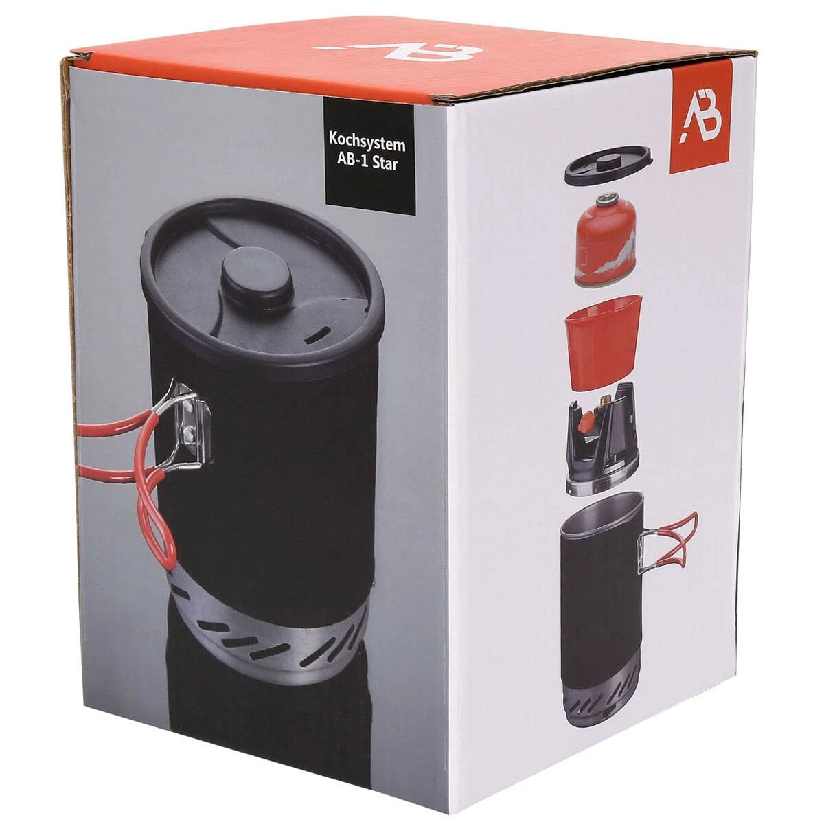 Das Outdoor Kochsystem AB-1 Star ist ein kompakter Gaskocher im innovativen Design. Sein kleines Packmaß und sein geringes Gewicht machen ihn zum idealen Begleiter auf Wanderungen und Campingausflügen. Das Kochsystem besteht aus einem Topf, Heizrippen und einem Adapter für das Brennelement. Der 0,8 Liter fassende Kochtopf besitzt einen Neoprenüberzug, der das Essen sehr gut isoliert sowie vor Verbrennungen schützt. Des Weiteren ist er mit einem Wärmetauscher ausgestattet, was ihn in Verbindung mit dem Windschutz sehr effizient im Verbrauch macht. Der Brennstoffverbrauch wird im Gegensatz zu einfachen Gaskochern um ca. 40 % gesenkt. Der AB-1 Star kann mit allen handelsüblichen Gas-Schraub-Kartuschen betrieben werden.