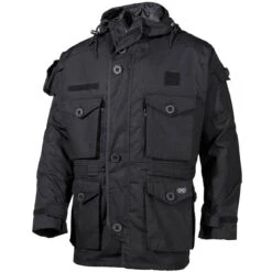 Die Kommando Jacke Smock ist eine Einsatzjacke mit herausragender Funktionalität. Die unterschiedlichsten Taschen bieten nahezu unendlich viel Stauraum: die 2 großen aufgesetzten Brusttaschen mit Patte, Knopf und seitlichem Reißverschluss besitzen innen einen Kunststoff D-Ring. Neben der rechten Brusttasche befindet sich ein Reißverschluss zum Durchgreifen. Die 4 aufgesetzten Hüfttaschen mit Patte und Knopf haben im Inneren zusätzlich einen Kunststoff D-Ring und eine Wasseröse. Des Weiteren gibt es 2 aufgesetzte Oberarmtaschen mit Patte und Knopf (die linke besitzt noch zusätzliche eine Stifttasche) und eine große aufgesetzte Rückentasche mit Patte und Knöpfen sowie seitlichen Reißverschlüssen und Wasseröse. Im Inneren des Smocks befinden sich 2 aufgesetzte Brusttaschen mit Reißverschluss. Die Jacke wird mit einem hochwertigen, stabilen und verdeckten 2-Wege Front-Reißverschluss geschlossen, welcher zusätzlich eine geknöpfte Abdeckleiste mit Klettverschlüssen oben und unten hat. Die Kapuze hat einen Tunnelzug, Kordelstopper und ein mit Draht verstärktes Kapuzenschild. Die Schultern und die Ellbogen sind verstärkt (Besatz). Es gibt Ellbogentaschen mit Klettverschlüssen, in denen man Protektoren unterbringen kann. Außerdem gibt es 2 Klettflausches auf Brusthöhe (damit man die Jacke durch das Anbringen von Patches und Abzeichen individualisieren kann), eine Achselbelüftung mit 2-Wege-Reißverschluss und einen Tunnelzug an der Taille mit Kordelstoppern. Die Ärmel lassen sich mittels Klettverschlüssen in der Weite verstellen.