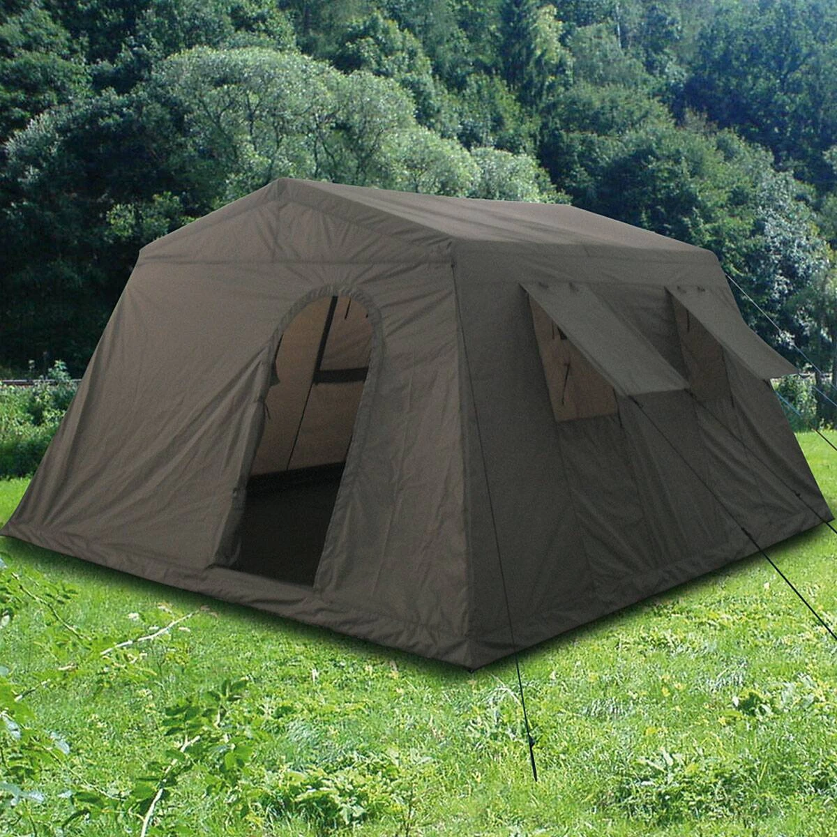 Das Großzelt 3,4 × 3,1 m oliv ist als vielseitiges Sechs-Personen-Grppenzelt konzipiert. Auf 10,5 m² rechteckiger Grundfläche bietet es 1,80 m Stehhöhe – ideal, um sich bequem umzuziehen oder eine Feldküche einzurichten. Zwei gegenüberliegende Eingänge erleichtern den Zugang, während vier aufrollbare Fenster mit integrierten Moskitonetzen und eine Öffnung im Dach für dauerhaften Luftaustausch ohne Insekten sorgen. Plane und Boden bestehen aus wasserabweisendem, reißfestem Gewebe; getapte Nähte halten Feuchtigkeit draußen. Ein pulverbeschichtetes Stahlrohrgestänge und umlaufende Abspannpunkte verleihen dem Zelt sichere Standfestigkeit bei Wind und Wetter.