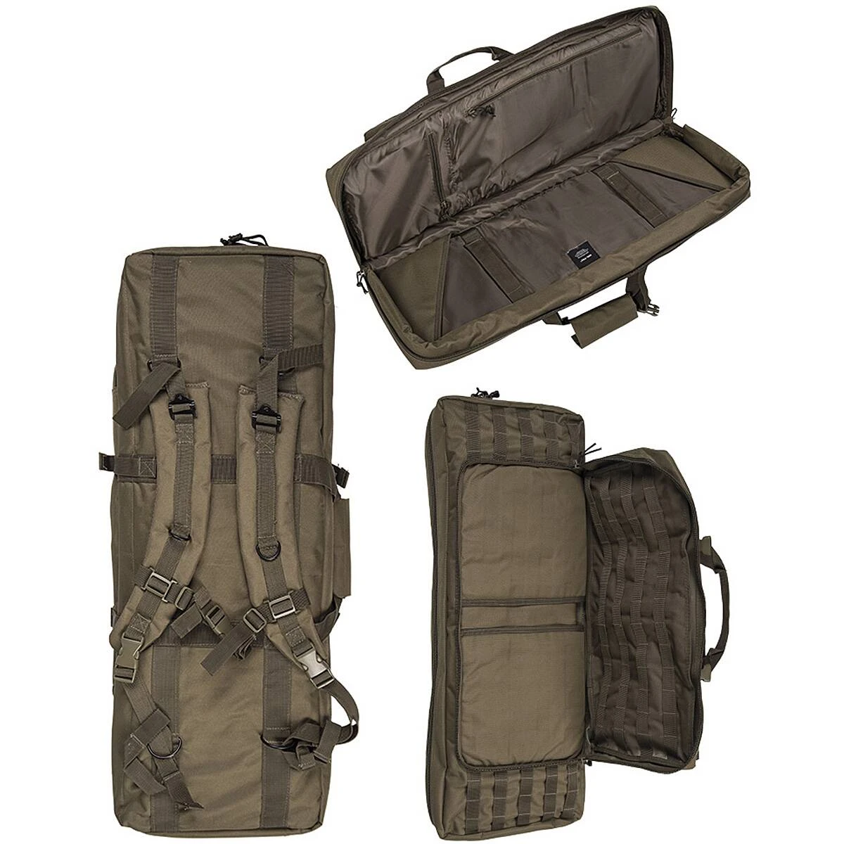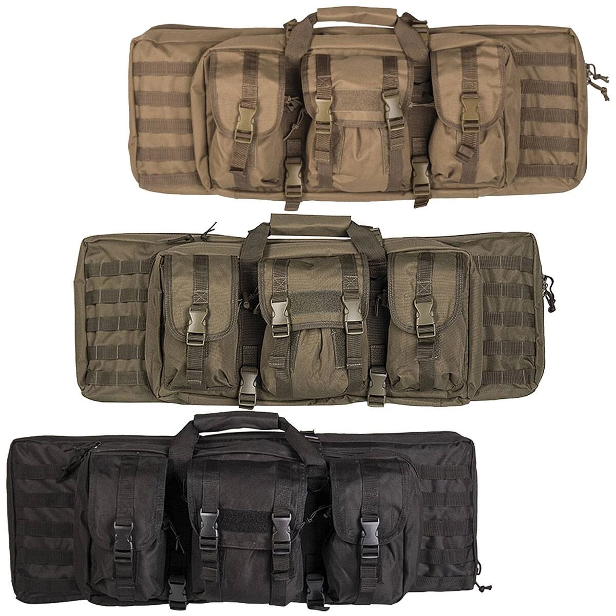 Dieses robuste und hochwertige Gewehrfutteral eignet sich aufgrund seiner großen Kapazität hervorragend für den Airsoftsport. Es besitzt ein Hauptfach mit Klett-Fixiergurten, Steckfächern und 2 Reißverschlussfächern sowie ein abklappbares Vorderteil mit 3 aufgesetzten Außentaschen mit Steckverschluss und Klettsicherung. Am Haupt- und am Frontfach befindet sich jeweils ein abschließbarer 2-Wege-Reißverschluss. Die Gewehrtasche kann mit den auf der Rückseite befindlichen, abnehmbaren Schultergurten, mit dem Umhängegurt oder dem gepolsterten Tragegriff getragen werden. Oben und unten gibt es außerdem Kompressionsriemen mit Steckschließen. Das Futteral eignet sich für Langwaffen bis 75 cm. Sämtliche Steckfächer und Taschen sind mit Schnapp- und Reißverschlüssen ausgerüstet. Außerdem gibt es diverse Molle-Schlaufen und D-Ringe zur Befestigung von weiteren Gegenständen.