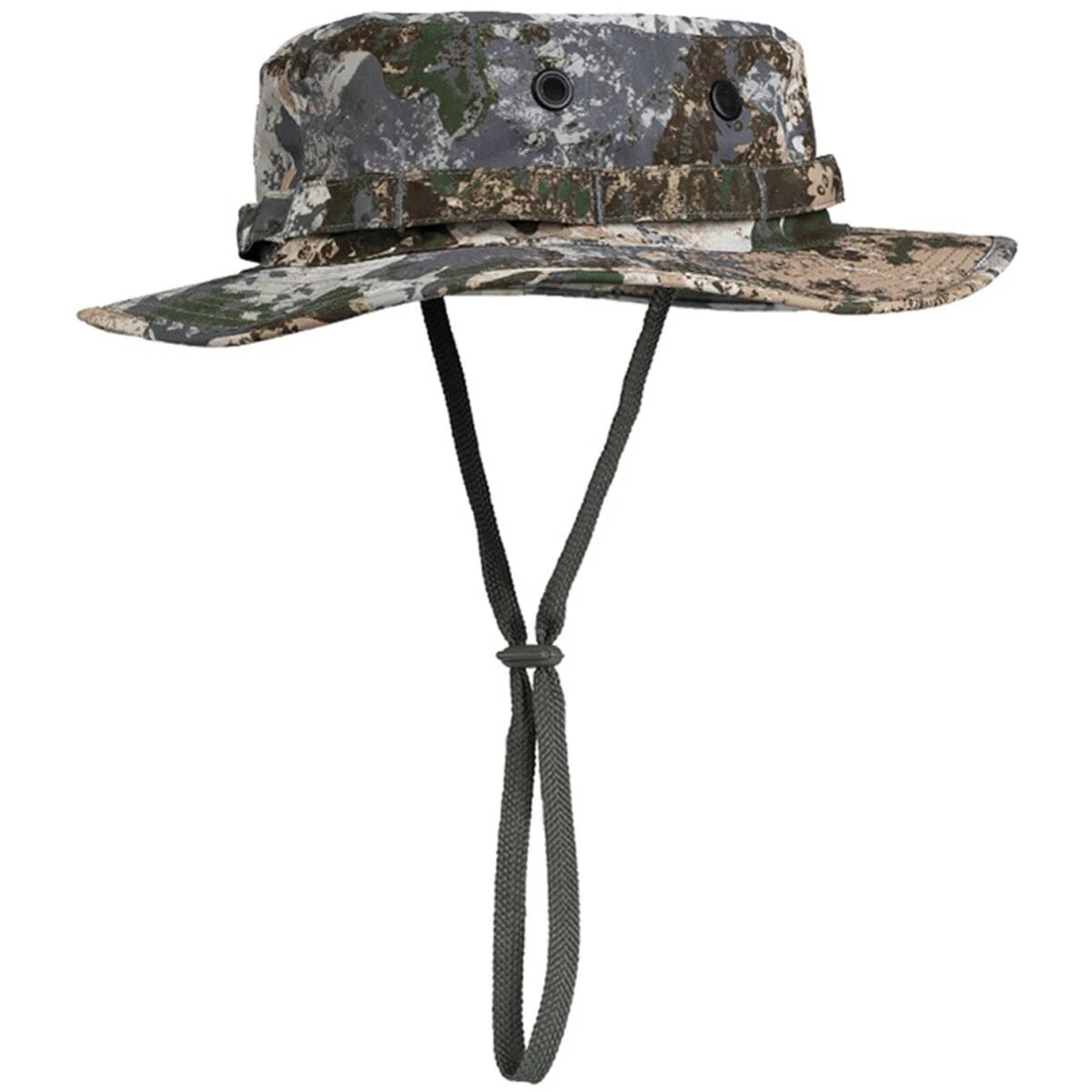 Der US GI Buschhut ist an heißen, sonnigen Tagen der ideale Kopfschutz. Er besitzt eine breite wellenförmige, ca. 8 cm breite Krempe. mit dem Kinnband kann diese nach oben umgeschlagen werden. Die rundumlaufenden Laschen dienen als Haltevorrichtung zur Anbringung von Tarn oder Kleinmaterial. Des Weiteren hat der Boonie vergitterte Belüftungsöffnungen.