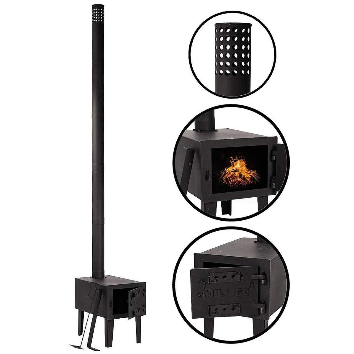 Dieser Zeltofen von Mil-Tec eignet sich für den Betrieb in feuerfesten Zelten mit Öffnung, Tipis, Jurten oder im Freien. Er kann ebenfalls zum Erwärmen von Essen genutzt werden. Der stabile Ofen eignet sich für jegliche Festbrennstoffe und besitzt ein großes Volumen für mehr Leistung. Der Aufbau ist sehr einfach und es wird nur ein Inbusschlüssel M6 (nicht im Lieferumfang enthalten) benötigt. Die Einzelteile befinden sich bei der Anlieferung im Korpus. Da es sich beim Material des Armeeofen um unlackiertes Stahlblech handelt, kann an vereinzelten Stellen ein natürlicher Rostansatz zum Vorschein kommen. Wir empfehlen deshalb zur Pflege die Verwendung von Fetten oder Ölen. Bitte beachten Sie vor dem Aufbau und der Inbetriebnahme die Bedienungsanleitung.