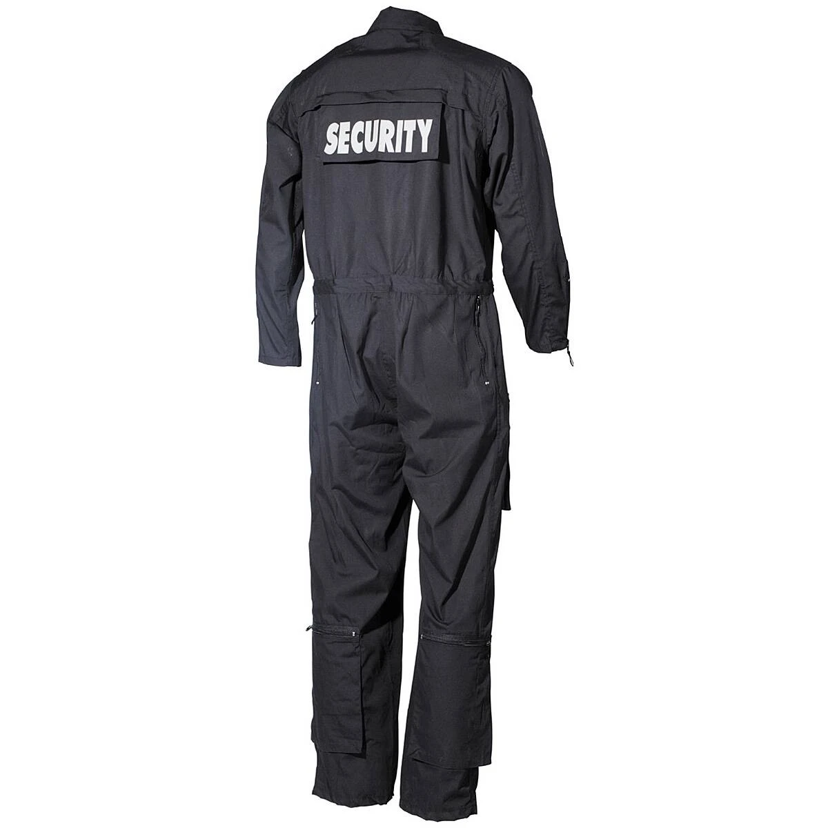 Dieser praktische Security-Overall besitzt einen 2-Wege-Frontreißverschluss, 2 Brusttaschen, 2 Hüfttaschen, 2 Beintaschen und 1 Ärmeltasche. Alle Taschen sind mit Reißverschlüssen zu verschließen. An der Taille befindet sich ein Kordelzug und an den Ärmel- und Beinenden gibt es Reißverschlüsse. Die Security-Kombi wird mit je einem bedruckten („SECURITY“) und unbedrucktem Rückenpatch ausgeliefert.