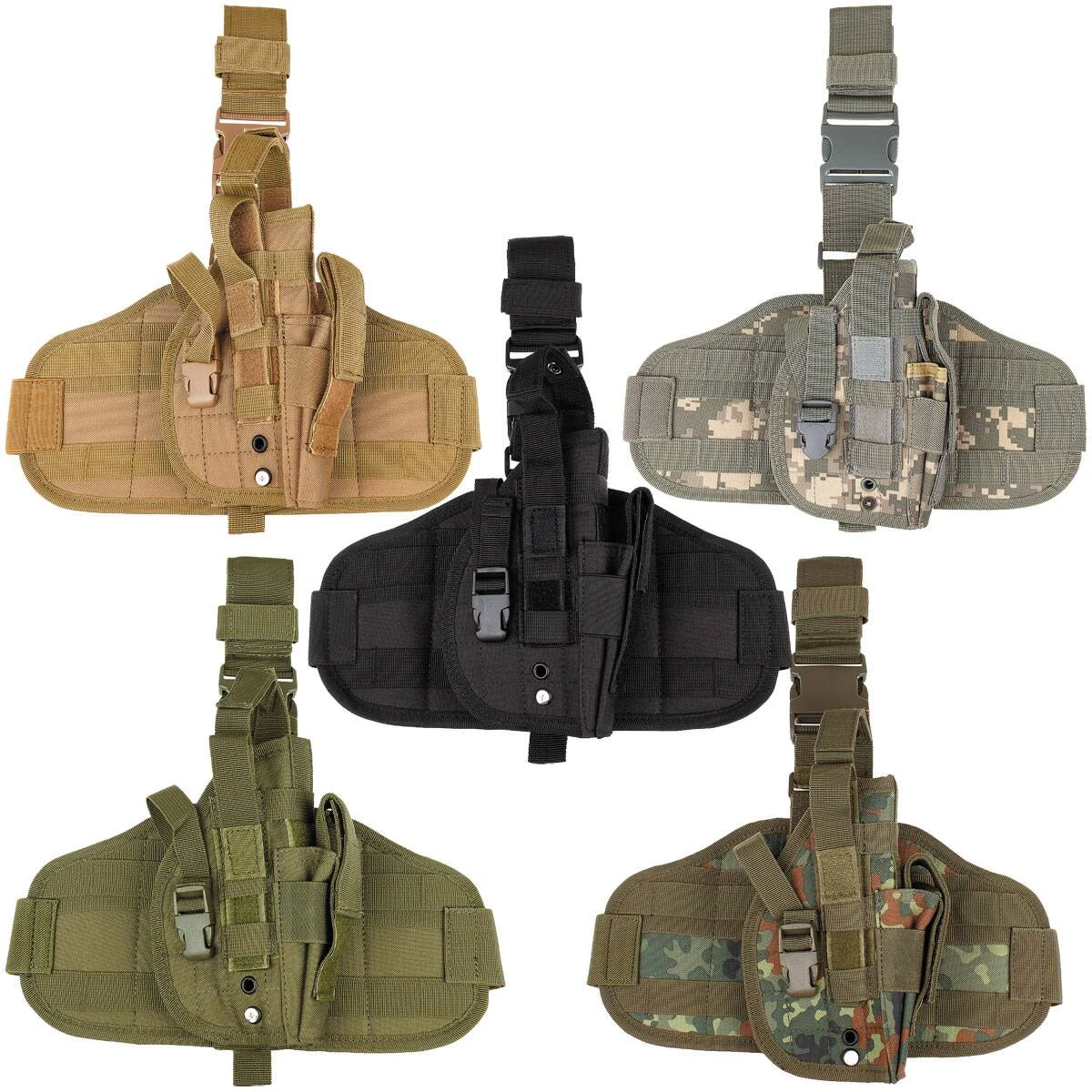 Das taktische Oberschenkelholster besitzt eine verstärkte Trägerplatt mit Molle-Aufnahmeschlaufen, die es ermöglichen weitere Ausrüstungsgegenstände an das Holster anzubringen. Durch die verstellbare Klettsicherung mit zusätzlicher Druckknopfsicherung ist es für nahezu alle Kurzwaffen geeignet. Des Weiteren besitzt das Pistolenholster einen verstellbaren Beingurt mit Klickverschluss und elastischem Einsatz, einen abnehmbare, höhenverstellbare Gürtelschlaufe (mit Klett für bis zu 6 cm breite Gürtel) und eine seitlich aufgesetzte Magazintasche mit abnehmbarem, verstellbarem Klettverschluss. Auf der Rückseite hat es einen rutschfesten PVC-Besatz. Es ist für Rechtshänder geeignet.