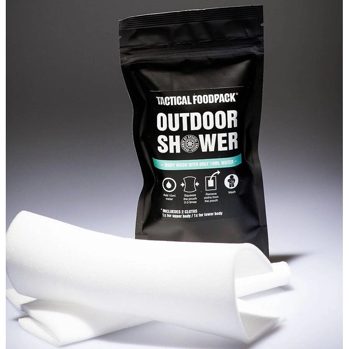 Die Outdoor Shower von Tactical Foodpack ist die innovative Waschlösung für den Outdoorbereich. Wenn man sich in einer Situation befindet, in der es an Wasser oder einer Waschgelegenheit mangelt, ist es eine perfekte und einfache Lösung. In der Packung befinden sich 2 verschiedene selbstschäumende und weiche Einweg-Schwammtücher. Alles, was man noch benötigt, sind 10 ml Wasser – es ist kein zusätzliches Reinigungsmittel notwendig. Man gibt einfach die kleine Menge Wasser in den Beutel, drückt ein paar Mal darauf und dann kann man mit dem Waschen beginnen. Das Produkt ist hautfreundlich, nicht sensibilisierend und frei von Konservierungsstoffen. Es enthält Panthenol, so dass es auch für die Reinigung kleinerer Hautabschürfungen oder -schnitte geeignet ist. Nach dem Waschen muss die Haut nicht abgespült werden. Sie wird sauber und befeuchtet sein.